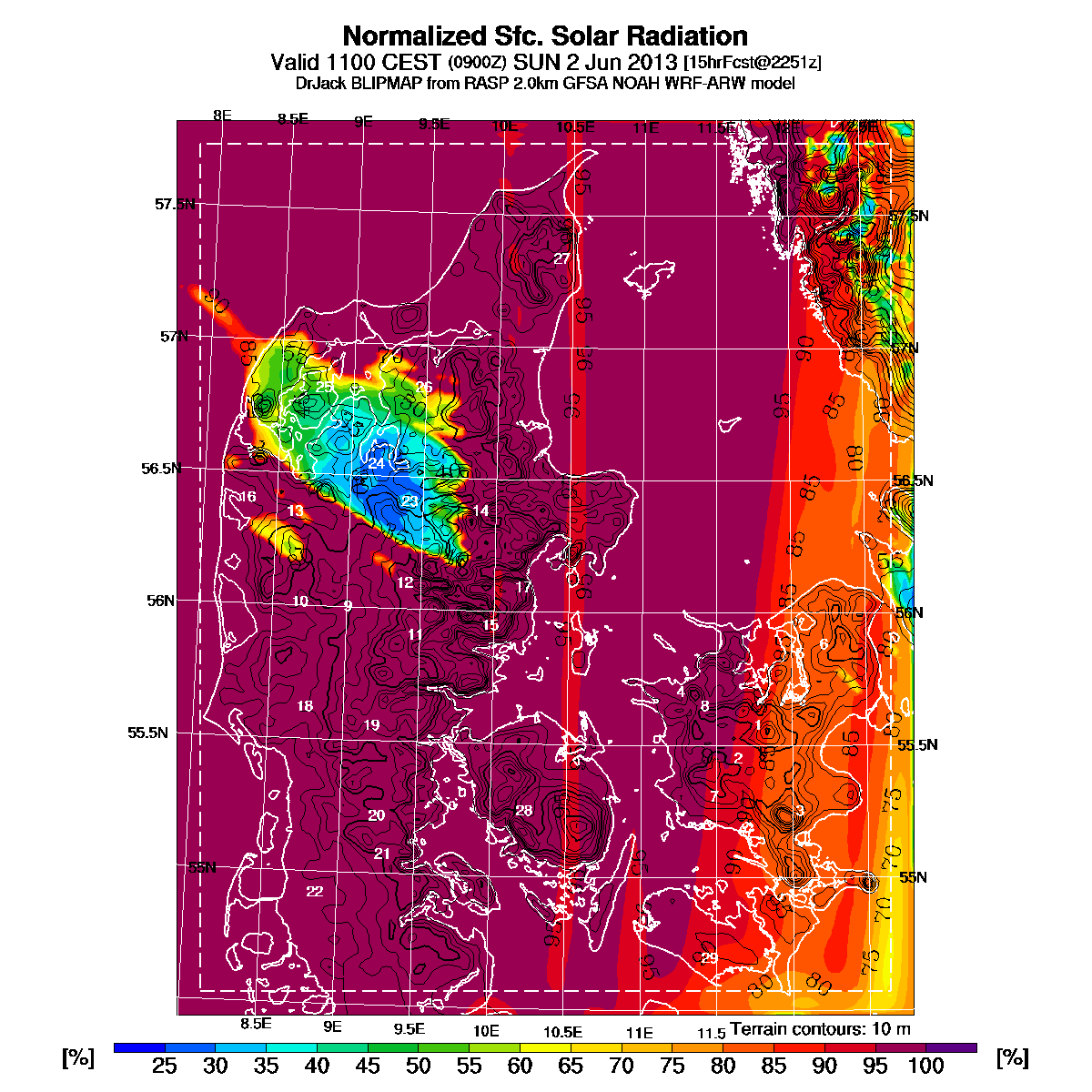 store områder/grove konturer med reduceret indstråling, indikerer høje skyer. 80% svarer til et ret tæt as-lag.
