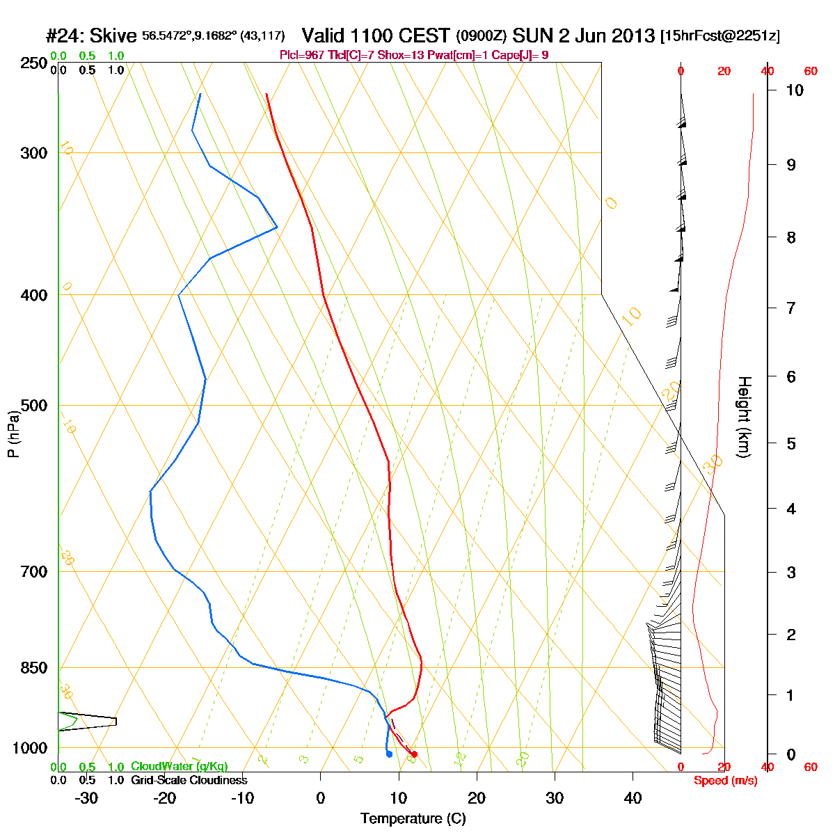 Vær opmærksom på at skyer der har mindre udstrækning end modellens opløsning, ikke altid reducerer indstrålingen (cu/sc).